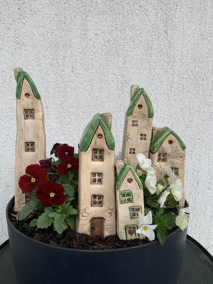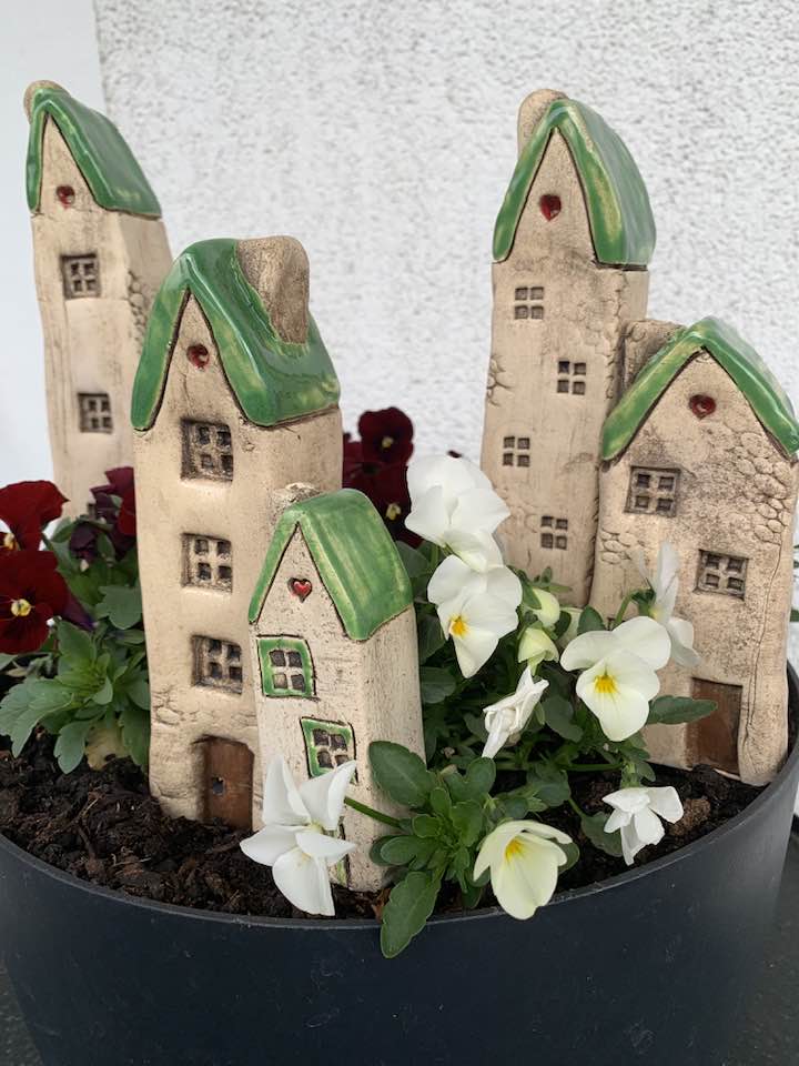 Keramické domečky jako dekorace do truhlíku nebo domů. V sadě je 5 domečků. Největší domeček má výšku 22cm.